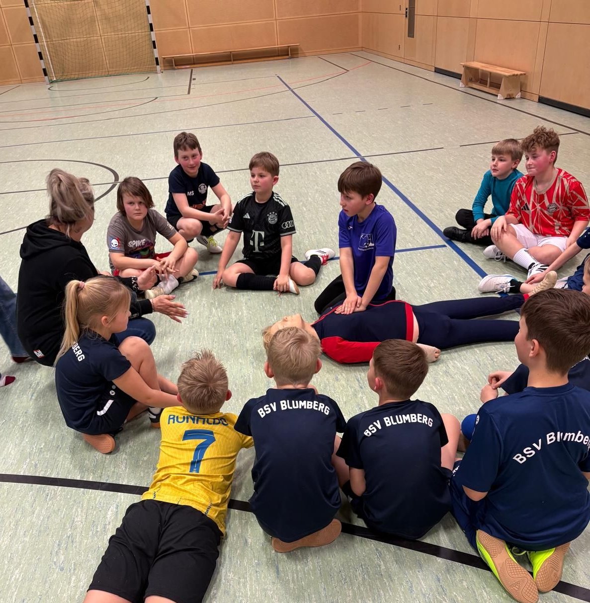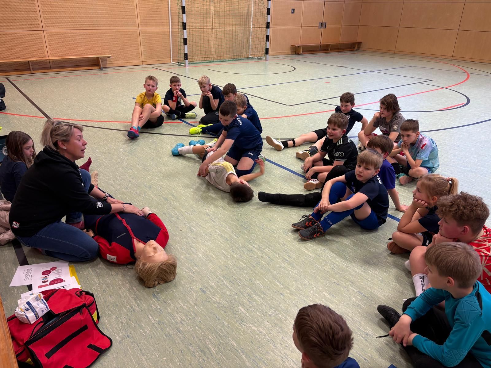 Verantwortung übernehmen, helfen können und als Team zusammenstehen — genau das stand im Mittelpunkt unseres Erste-Hilfe-Trainings der E-Jugend. In der Sporthalle lernten die Kinder auf spielerische und zugleich sehr praxisnahe Weise, wie sie in Notfällen richtig reagieren.