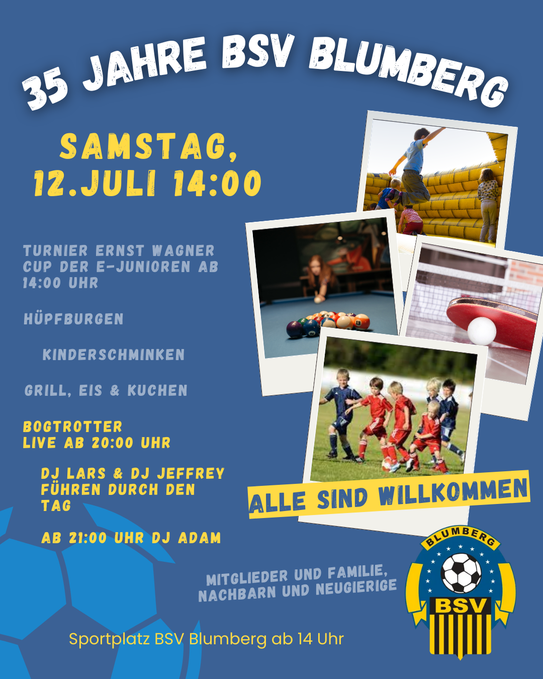 Den 30. konnten wir leider nicht mit euch feiern, da war so ein Virus im Umlauf, aber aus diesem Grund wollen wir mit euch den 35. umso größer feiern. Wir starten am 12.07.25 um 14:00 Uhr mit dem Ernst-Wagner Cup der E-Jugend. Parallel stellen sich die weiteren Abteilungen des BSV Blumberg vor. Ganz besonders freuen wir uns auf das Programm unsere neuen Turnabteilung. Zusätzlich haben wir für unsere Kinder ein buntes Programm organisiert. Von Kinderschminken, Airbrush-Tattoo, Hüpfburgen und kleine Spiele der Abteilung Tischtennis sollte für jede Altersgruppe was dabei sein. Für das leibliche Wohl wird natürlich auch gesorgt. Am Tage werden wir durch die DJ`s Lars&Jeffrey unterstützt, diese begleiten duch den Tag. Ab 20:00 Uhr spielen die Bogtrotter für euch auf und zum Abschluss wird DJ Adam die Tanzfläche zum Brodeln bringen. Wir danken den vielen Spendern, die uns finanziell unterstützt haben. Ohne die Unterstützung wäre die Anmietung eines großen Festzelt, einer Bühne und den vielen notwendigen Kleinigkeiten nicht in diesem Umfang möglich gewesen.
