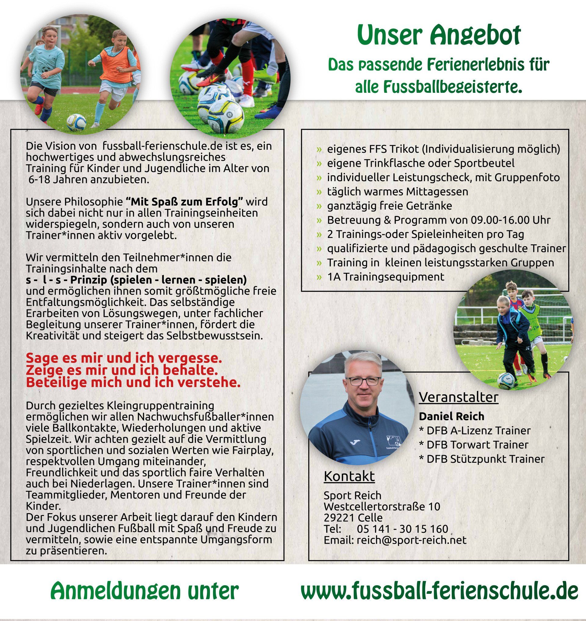 Fußball die schönste Nebensache der Welt. Auch in diesem Jahr bieten wir in Zusammenarbeit mit der fussball-ferienschule.de, für alle Fußballbegeisterten Jungs und Mädchen, von 6-18 Jahren, ein Fußballcamp an. Viele der Kids kommen jedes Jahr erneut sehr gerne in das Camp von Daniel Reich. Warum? Trainingstechnisch immer auf dem neuesten Stand, ist dieser Punkt eigentlich nur Nebensache. Das Motto „mit Spaß zum Erfolg“ spürt man hier einfach in jeder Sekunde des Camps. Mit dem 5 Tage Fußballcamp der fussball.ferienschule.de haben wir das passende Angebot für alle fußballbegeisterten Jungen und Mädchen, unabhängig ob sie im Verein spielen oder nicht. Wir vermitteln den Teilnehmer*innen die Trainingsinhalte nach dem s * l * s – Prinzip (spielen – lernen – spielen) und ermöglichen ihnen somit größtmögliche freie Entfaltungsmöglichkeit. Das selbständige Erarbeiten von Lösungswegen, unter fachlicher Begleitung unserer Trainer*innen, fördert die Kreativität und steigert das Selbstbewusstsein. Kognitive, koordinative und technische Elemente bilden den Schwerpunkt unserer Trainingsprogramme. Durch gezieltes Kleingruppentraining ermöglichen wir allen Nachwuchsfußballern*innen viele Ballkontakte, Wiederholungen und aktive Spielzeit. Wir achten gezielt auf die Vermittlung von sportlichen und sozialen Werten wie Fairplay, respektvollem Umgang miteinander, Freundlichkeit und das sportlich faire Verhalten auch bei Niederlagen. Unsere Trainer*innen sind Teammitglieder, Mentoren und Freunde der Kinder. Der Fokus unserer Arbeit liegt darauf den Kindern und Jugendlichen Fußball mit Spaß und Freude zu vermitteln, sowie eine entspannte Umgangsform zu präsentieren. Wir motivieren die Teilnehmer*innen Situationen besser zu gestalten, Fehler zu verringern und durch den Spaß am Training die persönliche Leistungsfähigkeit zu verbessern. Die Buchung des Camps erfolgt über die fussball.ferienschule.de .